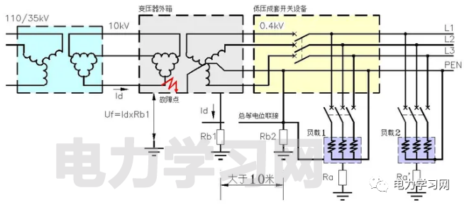 注意图中的右侧,黄色的部分就是低压开关柜,虚线部分是它的外壳,我们看到外壳与等电位联结直接相连。同时,我们还看到在图的右下角有1套所内的用电设备,它们的外壳也与等电位联结相连。