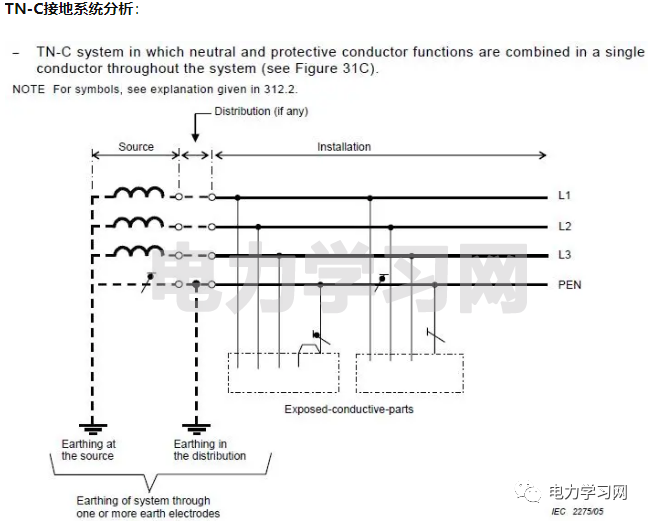 我们来看国际标准IEC60364《建筑物接地系统》中,有关TN-C的解释。注意,在这里T的意思是电源的中性点接地Q,N是用电设备的外露导电部分接地。