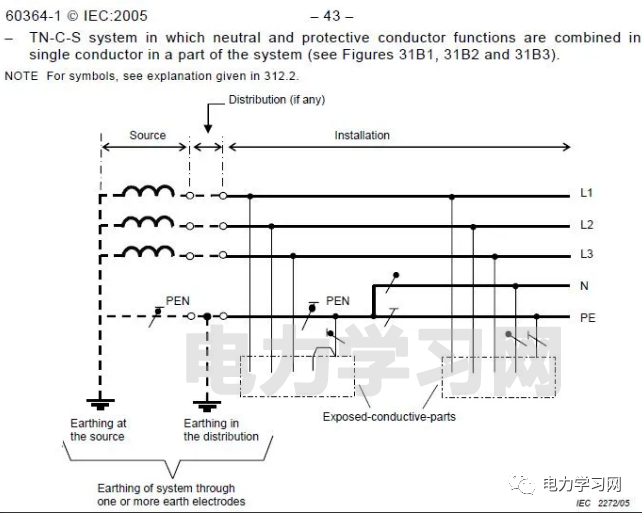 为了解决这个问题,IEC60364还给出了另外两个方案,就是TN-S和TN-C-S。由于TN-S中没有零线,因而我们以TN-C-S接地系统来讨论。以下是IEC60364中的TN-C-S说明: