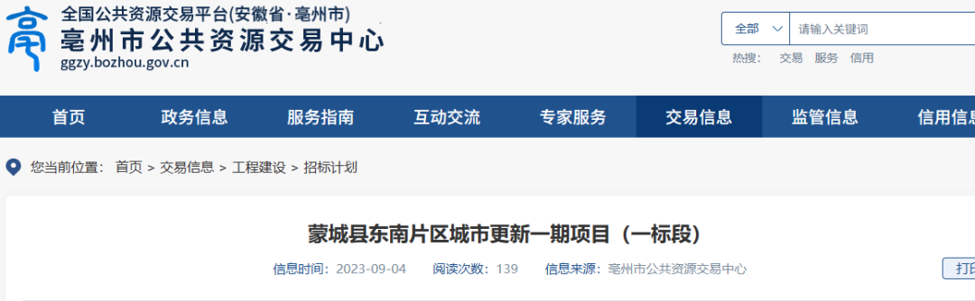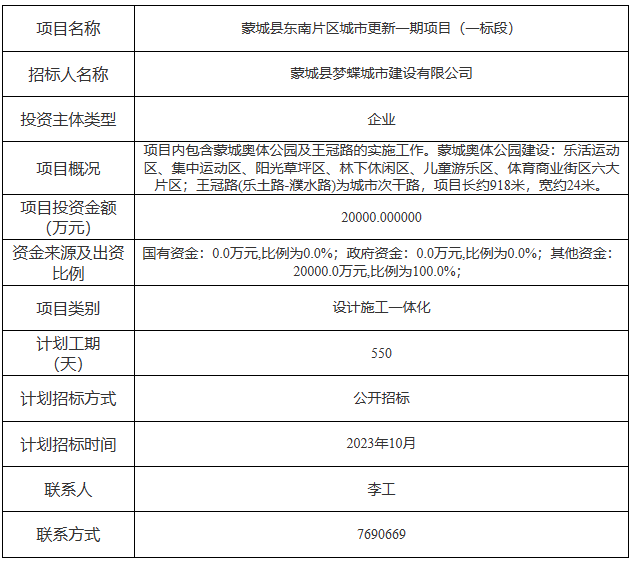 为便于潜在投标人及时了解招标信息,现将蒙城县梦蝶城市建设有限公司的招标计划发布如下: