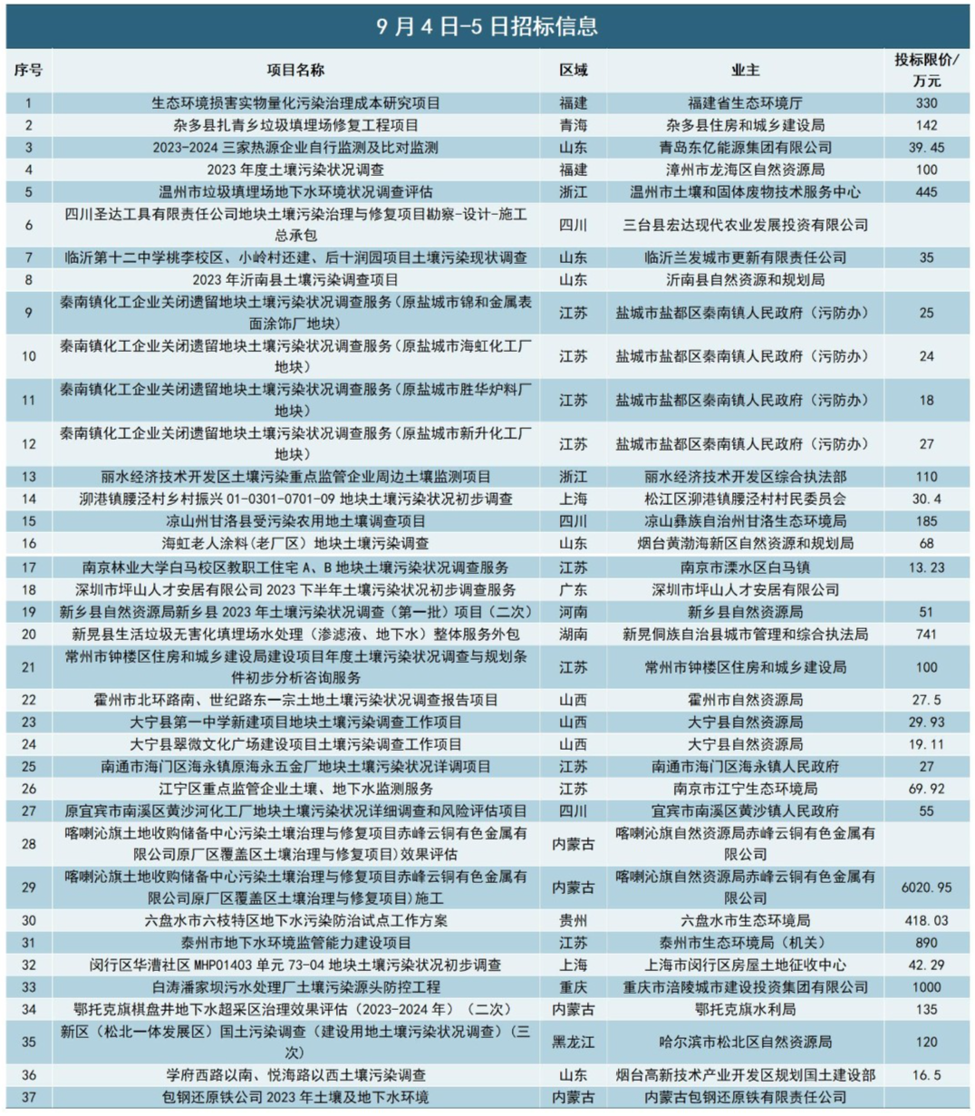 9月4日-5日新增招标信息37条,累计金额11355万元。今日关注内蒙古6020万元污染土壤治理与修复工程项目,供各位参考。