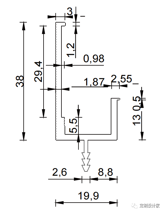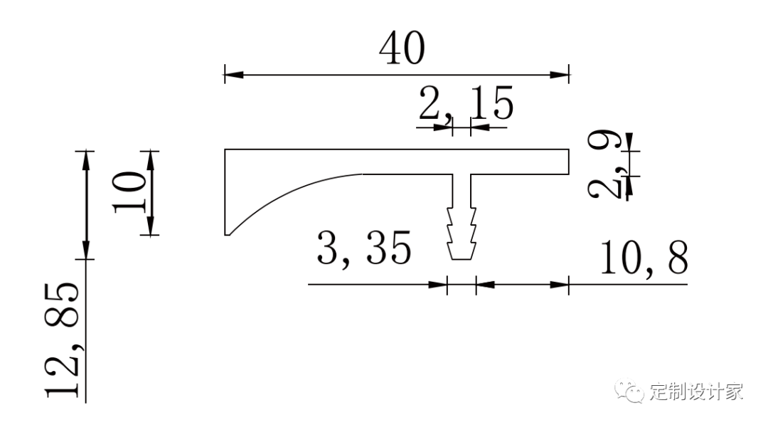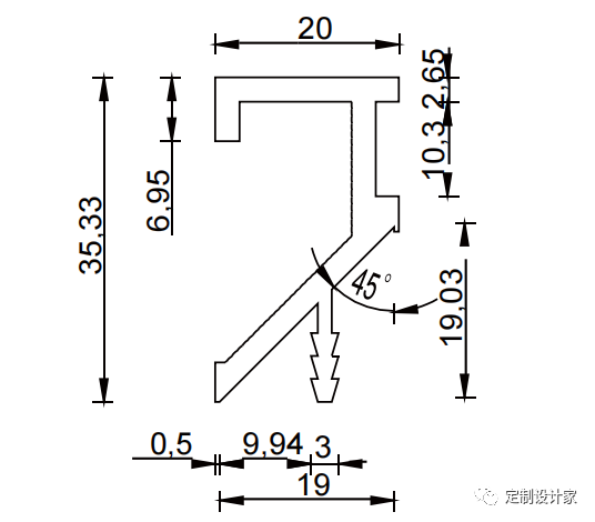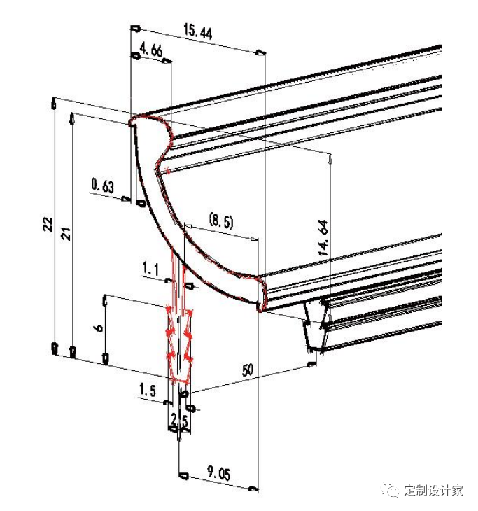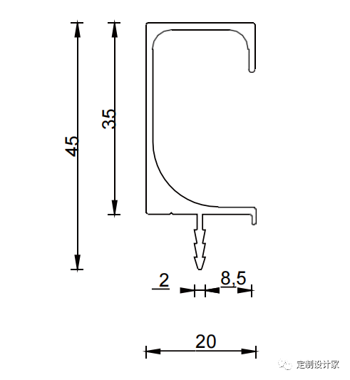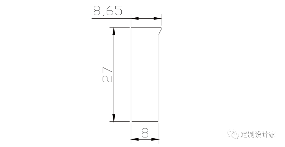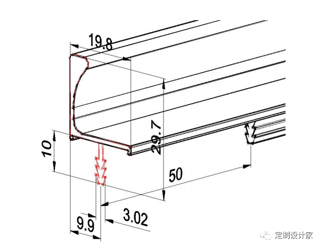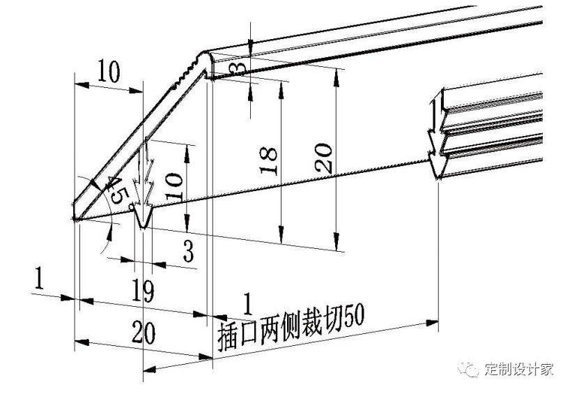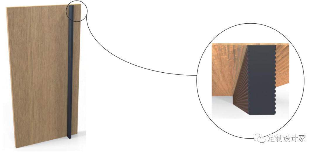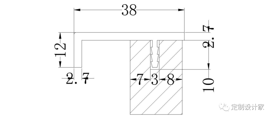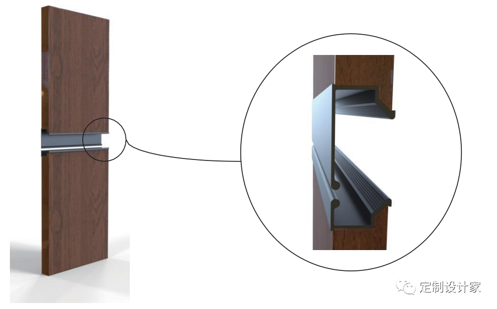 J008为封边拉手的一种,与门板配合使用,适配门板尺寸为18门板, 总长为3000mm,可整根定制可按段加工。
