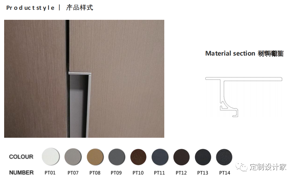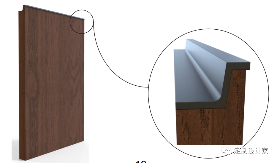 J009为封边拉手的一种,与门板配合使用,适配门板尺寸为18门板, 总长为3000mm,可整根定制可按段加工。