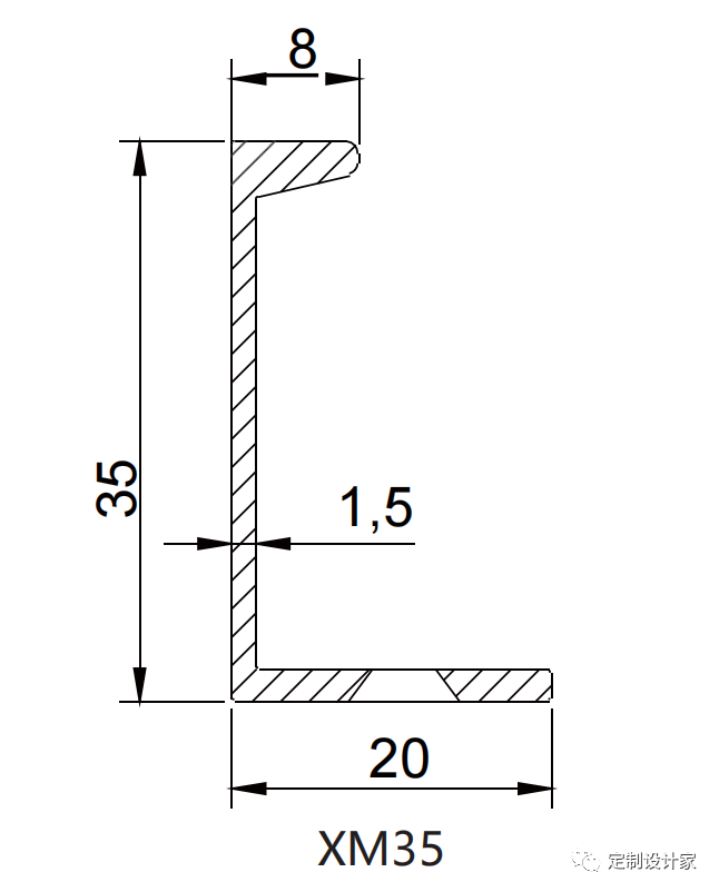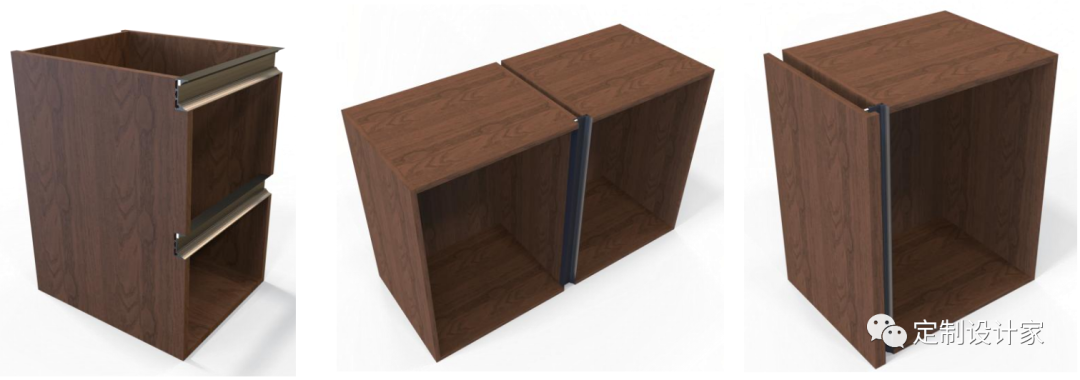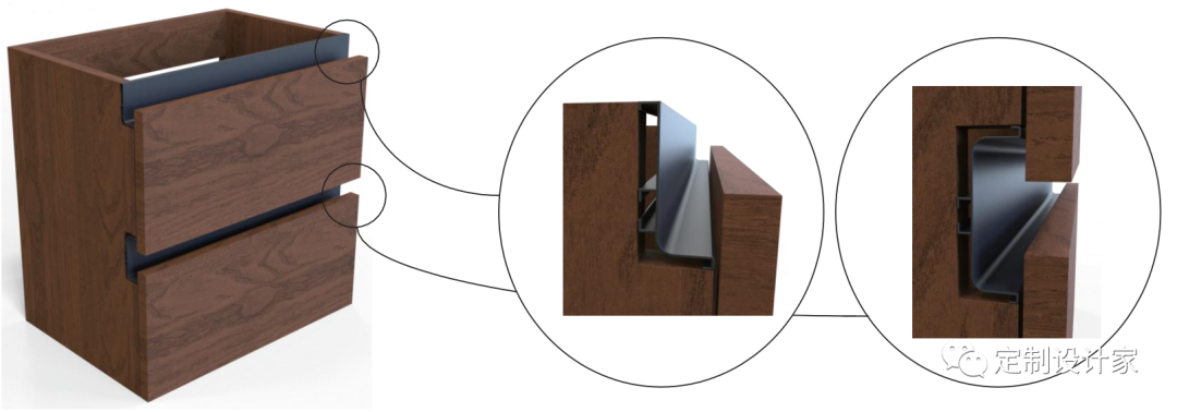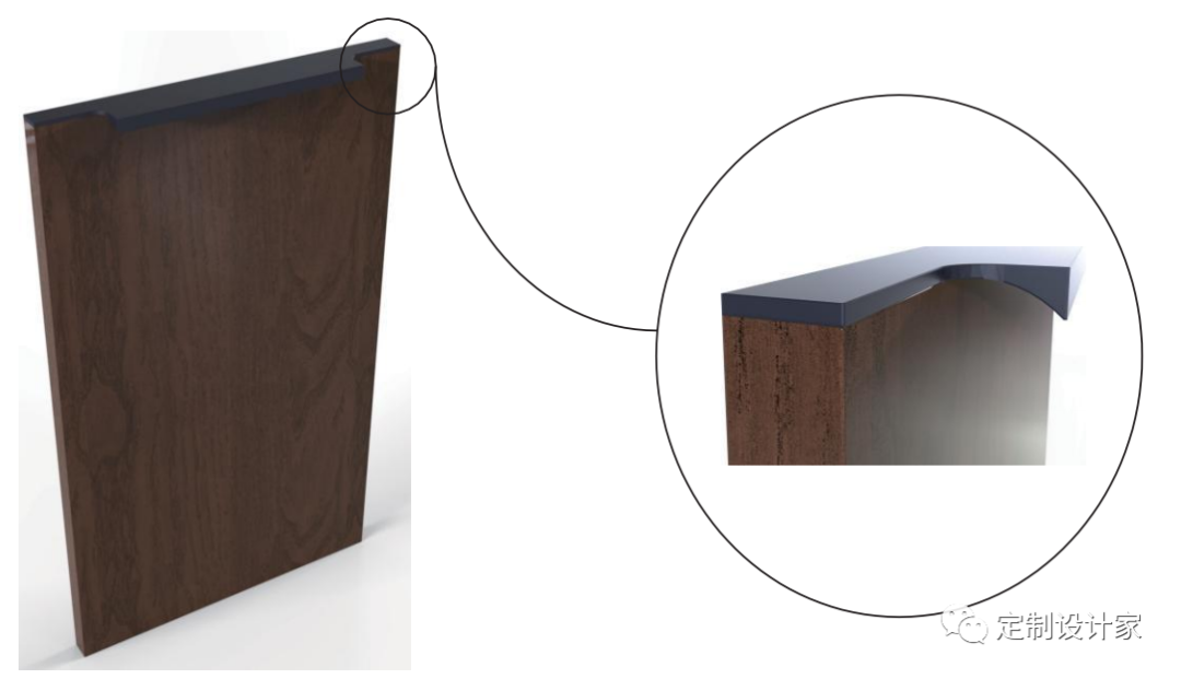 XM35为封边拉手的一种,安装在门板侧面,无需开豁,适配18木质门板, 总长为3000mm,可根据实际需求裁切(顶端安拉手除抽屉外,需两侧至少铣掉50mm,侧边安拉手可不铣型,也可根据设计师需求任意铣型)。