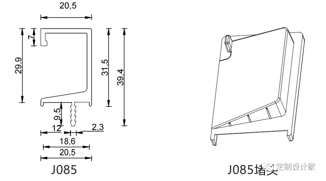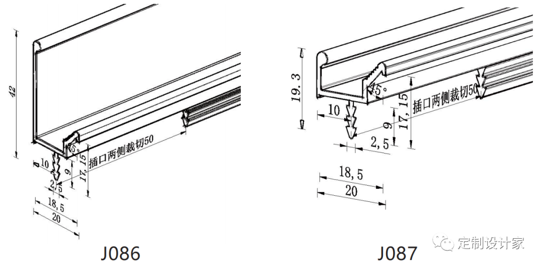 J085为嵌入式G型拉手的一种,与门板配合使用,适配门板尺寸为18木质门板, 总长为3000mm,可整根定制,可按段加工,使用J085堵头达成嵌入式拉手。