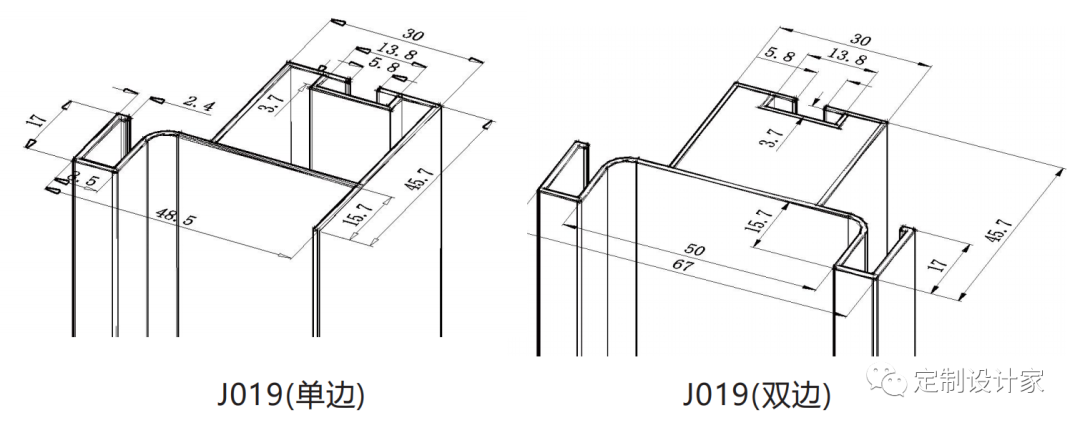 J019(单边)/J019(双边)分别为L型拉手和U型拉手的一种,与柜体配合使用, 单根长度为3000mm,为常规的竖装免拉手的一种。