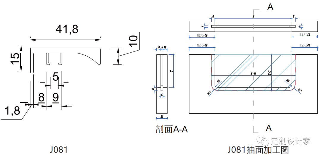 J081封边拉手的一种,安装在门板定边,为J080拉手的变种,可当抽屉拉手,并且芯板为5mm玻璃,需门板开豁夹玻璃,适配25木质门板,总长为6000mm,常规加工工艺:正面拉手不铣型;背面两端保留60mm;玻璃夹槽两端铣掉60mm。(其他工艺需提供图纸下单)