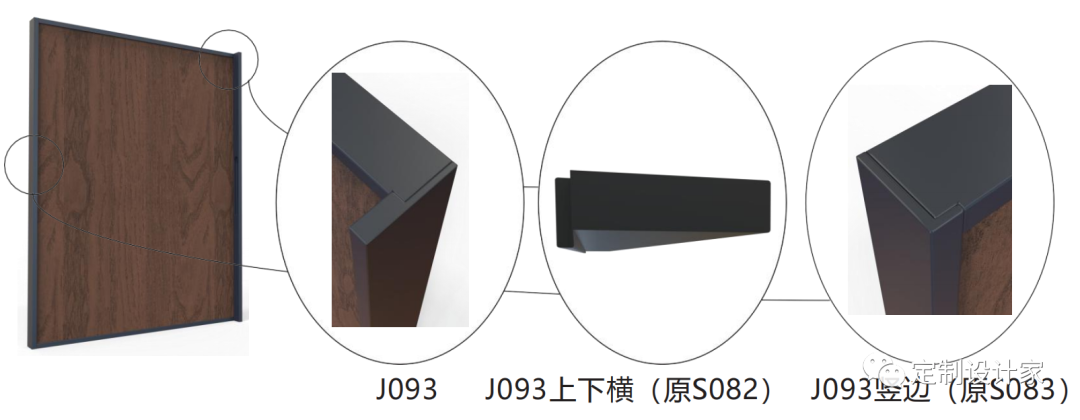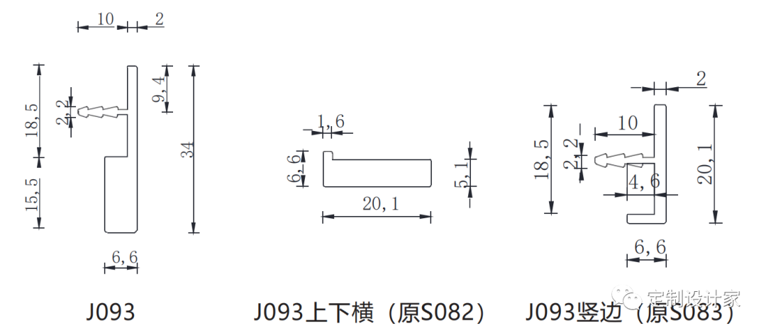 J093为封边拉手的一种,与18门板配合使用,使用J093边的拉手需要在板中开豁,拉手15.5mm处可选开拉手槽位置,拉手豁口长120mm,插口两端均铣掉6mm插口:拉手低沿距下100mm、拉手底沿距下1000mm、拉手中心居拉手边中心;同时J093可以配合J093竖边、J093上下横组成铝框拼框门,J093上下横两端前面开1.6*4.6mm豁口,两端铣∮8mm沉孔各两个,距边分别是20mm、50mm,J093竖边需插口两端均铣掉6mm插口使用。