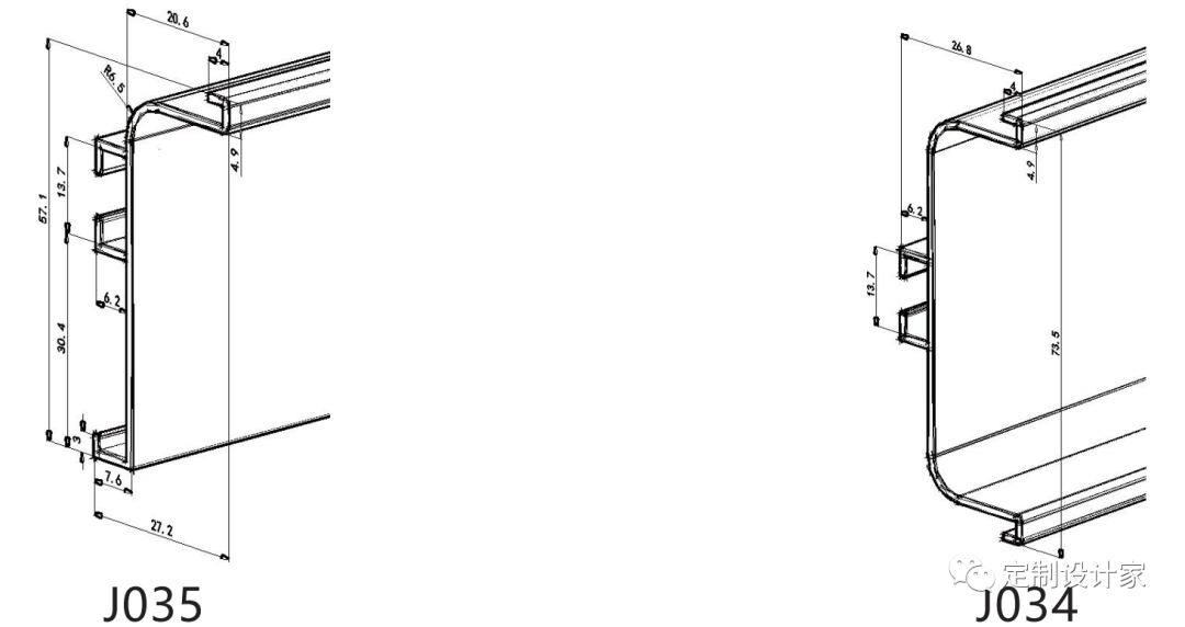 J035,J034为常规的柜体免拉手的一种,与柜体配合使用,侧板切豁,3000mm一根现场裁切。