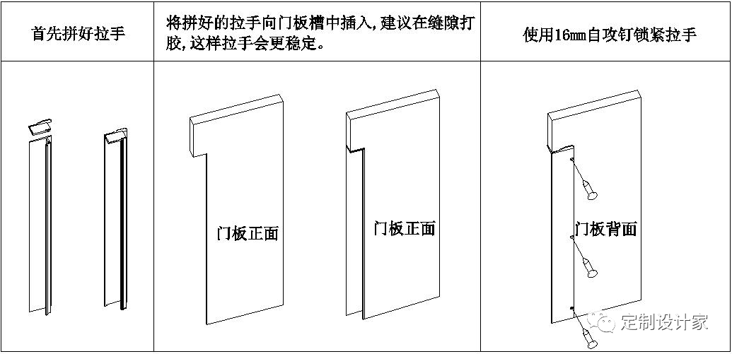 1、拉手槽一定要考虑油漆厚度,需要在厂内完成装配,避免现场安装时无法处理。第一次选配此款拉手需要做完整的小样快用来确认安装效果。