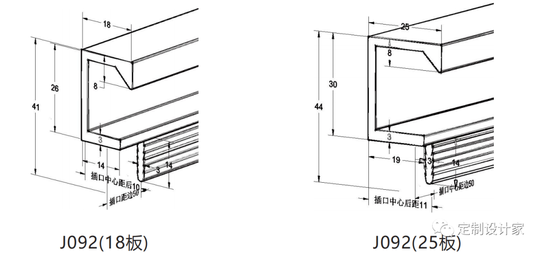 J092为G型拉手的一种,与门板配合使用,造型美观大方,适配门板尺寸为18 门板及25门板,满足大部分家居产业需求,定尺定裁的加工方式避免了端头裸漏铝本色的尴尬,避免了挑剔的高端客户对类似产品的不满,两个方案供客户选择,但加工时需注意方案一和方案二的开孔尺寸。