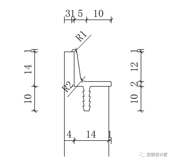 XN34为G型拉手的一种,与门板配合使用,适配门板尺寸为18木质门板,总长为3000mm,可整根定制,可按段加工。