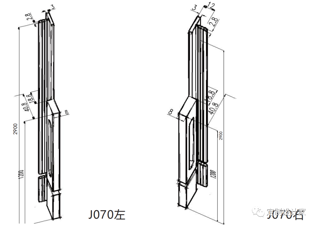 J070左/右为封边拉手的一种,与门板配合使用,拉手1200mm高,总高2900mm,定尺加工,拉手处有凹槽方便开启。