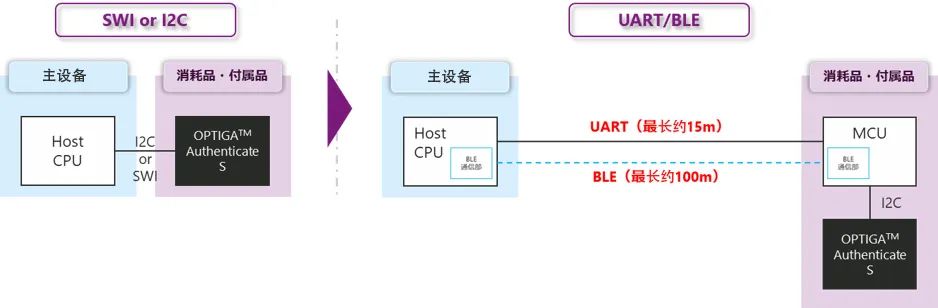 由于 OPTIGA™ Authenticate S (I2C/SWI) 的接口很难在超过 10 米的长距离上进行通信,因此 Macnica 制作了连接主机和 OPTIGA™ Authenticate S UART 的接口,如下图 (图1) 所示,其根据标准可实现长达 15 米的通信。除 UART 外,还可以更换低功耗蓝牙 (BLE) 接口,并且可以远程执行长达 100 米的真实性测定。