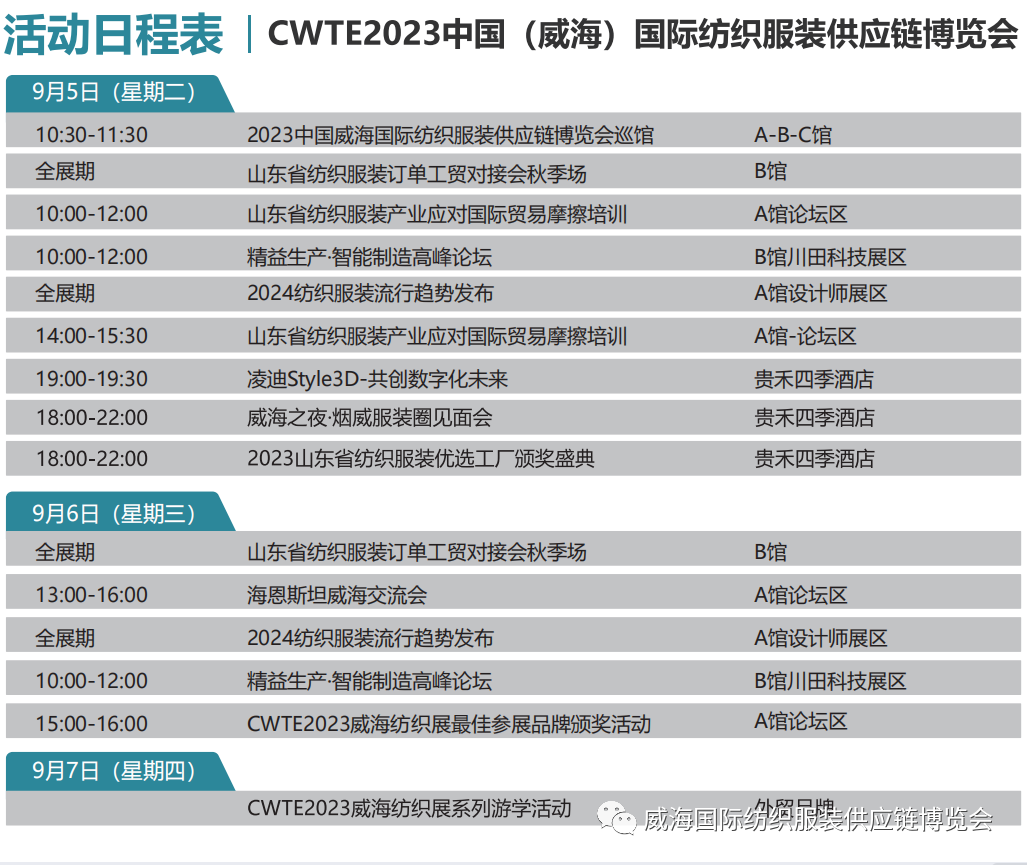 作为烟威地区的纺织服装行业品牌展会,由中国纺织工业联合会指导,山东省纺织服装行业协会、威海市纺织服装行业协会主办、威海市工业和信息化局支持的CWTE2023中国威海国际纺织服装供应链博览会即将于9月5-7日在威海国际展览中心A\B\C馆及会议区开幕。展会规模2.6万平米,连续举办3天,展出产品有:面料辅料、流行纱线、服装服饰、ODM\OEM、家纺玩具、智能制造、职业装团服。通过展示新材料、新技术与合作需求,搭建贸易供需合作,成为北方地区最具影响力产业链交易平台···