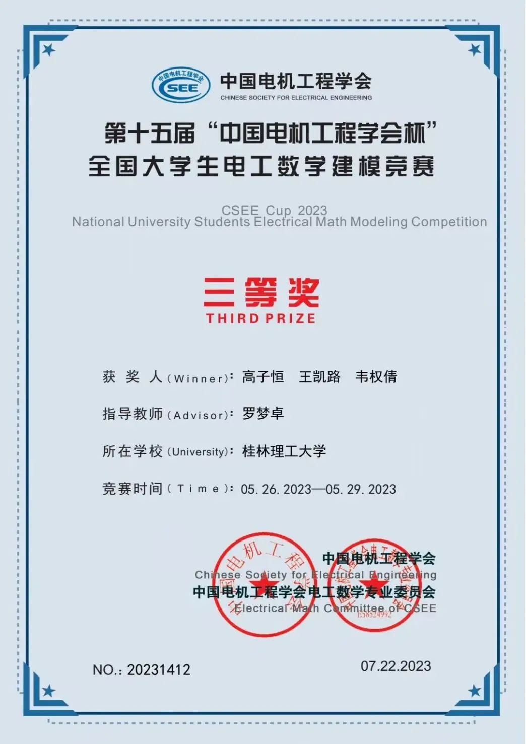 我院学生高子恒、王凯路、韦权倩组成的团队荣获“中国电机工程学会杯”全国大学生电工数学建模竞赛全国三等奖