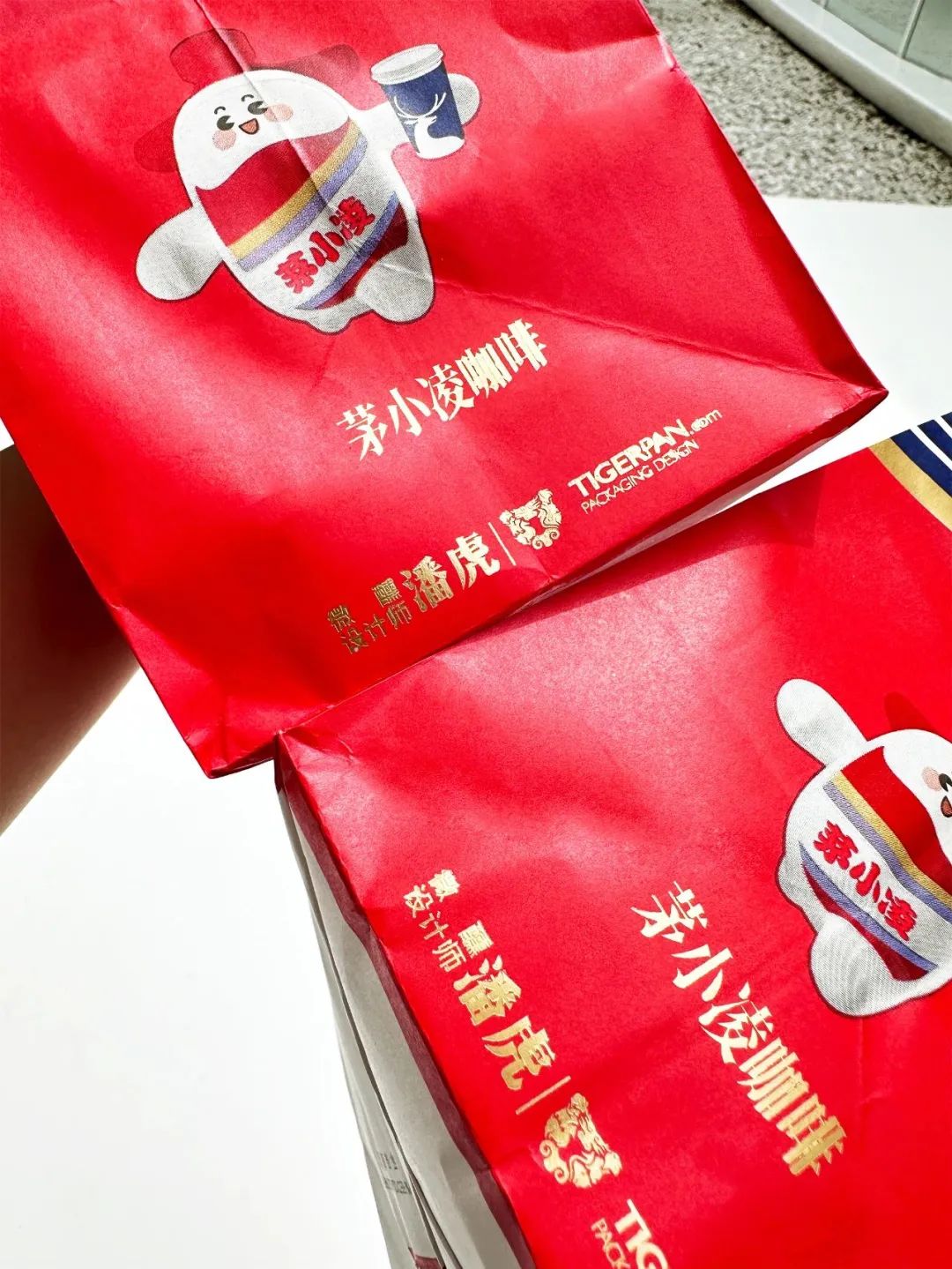 上线首周,还推出了全新联名款包装以及贴纸等周边,其中在杯套及袋装设计上可看到,外观结合了茅台酒经典的酒标包装做呈现,斜切条纹LOGO以“酱香拿铁”四字为视觉锤,搭配“美酒加咖啡,就爱这一杯”的联名slogan,在正红色背景的映衬下多了几分复古感,亮点十足。