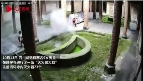四川威远县两名9岁的小男孩到静宁寺玩耍,趁人员不备,利用灭火器进行了一场“大战”。据统计,他们先后损坏寺内灭火器23个。
