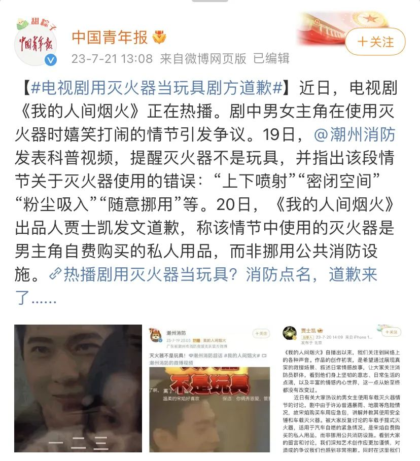 近日,微博热搜#热播剧现约会玩耍灭火器画面#,引起了大家的注意,讲的是热播剧中男女主角在使用灭火器时竟然嬉笑打闹。