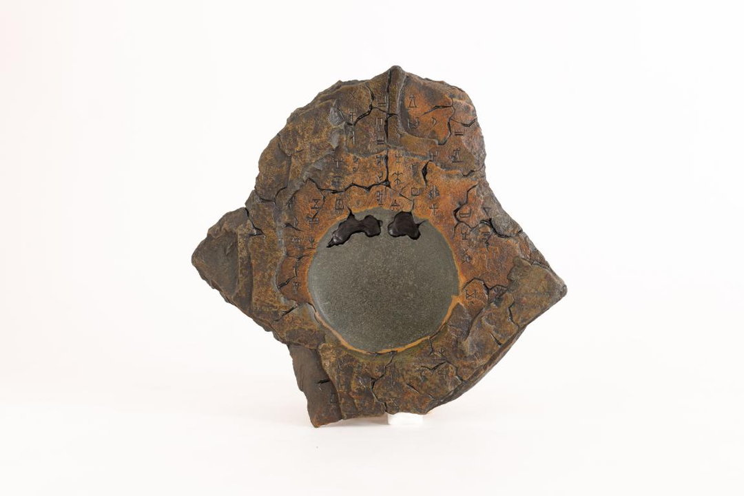 荣获江西省工艺美术最高奖“杜鹃奖”。依形施艺,故保留天然造型石皮刻甲骨纹之遗痕,古朴沧桑。甲骨文,距今已有三千余年,它不仅是研究我国文字源流的最早而有系统的资料,同时也是研究甲骨文书法重要的财富,对中国殷商史的研究起到深远影响和重大推动作用,给子孙后代留下一份极其珍贵的历史文化遗产。