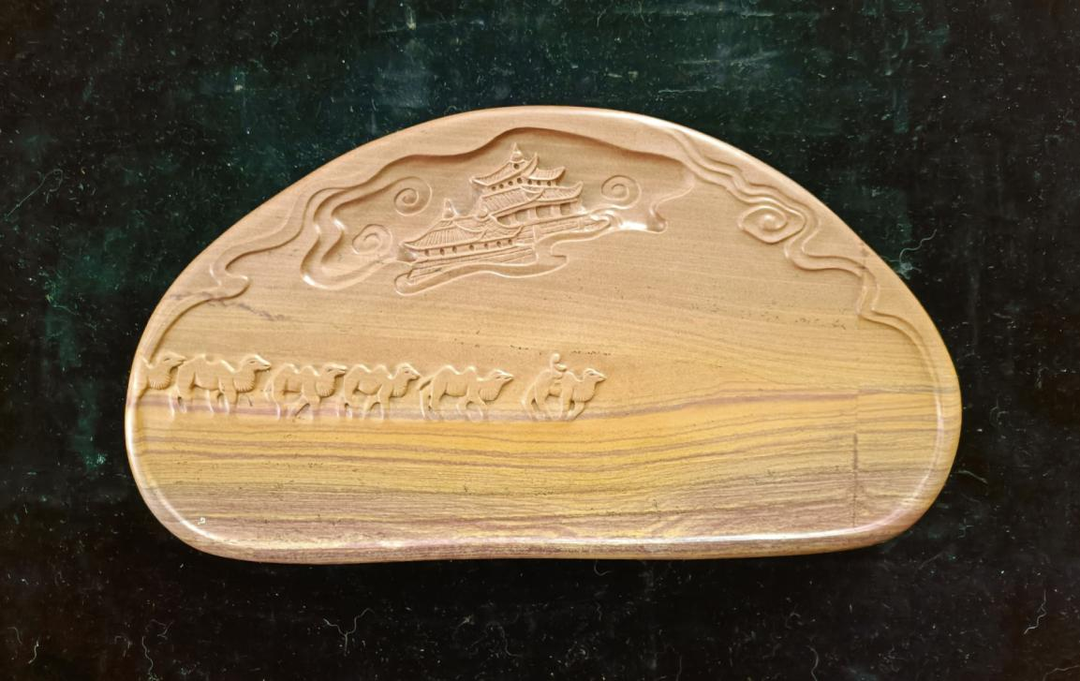 作品采用紫金石材的天然纹理特性,设计雕刻出沙漠里一队骆驼,驼队上方出现一片祥云,祥云里有宫殿呈现海市蜃楼之景象。