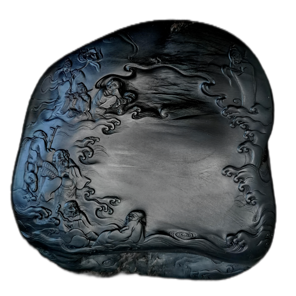 歙砚眉子坑眉纹,因势设计八仙,注重布局结构,脸部刻划,使小石头中见大场景。
