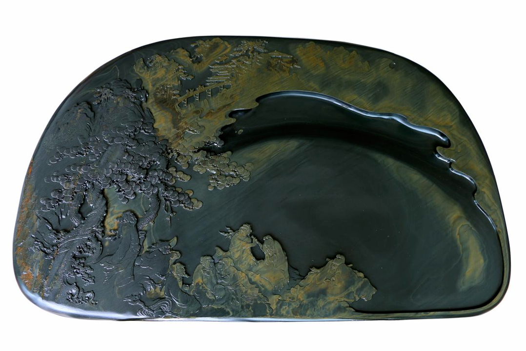 作者以天然石皮为苍翠嶙峋的山坡磊石,林壑优美,斜倚的劲松,横构之廊桥,望之蔚然而深秀。砚雕几位老人,或论道对弈,运筹帷幄画图之中,或赏景畅饮,远离尘世硝烟之外。整个画面极致地还原出古代文人雅聚时的意趣,使观此砚者仿佛置身于深山幽谷,如听松风阵阵,如触漫漫青茵。