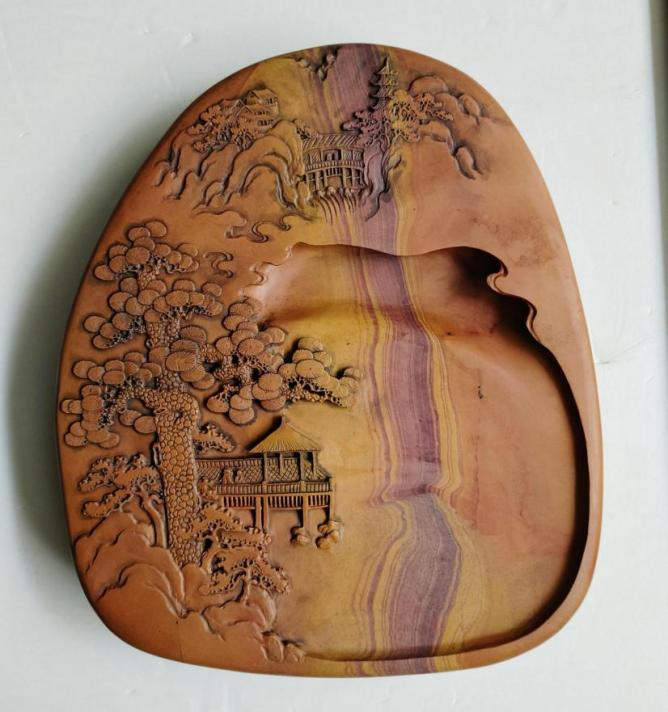 砚是利用淮南八公山紫金石设计雕刻而成,作者利用紫金石上天然形成的花纹做瀑布,瀑布倒挂由上到下一气呵成,犹如瀑布从天上来,再配上楼台亭阁,使作品观赏和实用价值同时拥有。