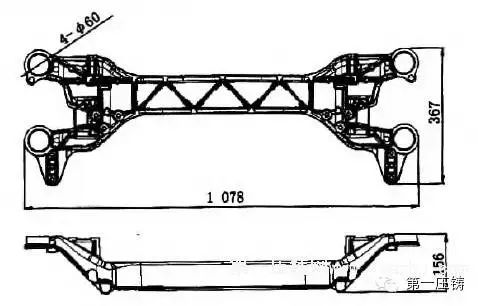 “传祺”轿车底盘后副车架的结构见图1,外形尺寸为1 078 mmX367 mmX156mm,平均壁厚为4 mm,质量为6.3 kg。副车架材质为A1~Mg合金,其力学性能指标为铸件本体抗拉强度≥240 MPa,屈服强度≥145MPa,伸长率≥6%,属于高强度、高韧性、耐腐蚀的大型薄壁复杂零件。由于轿车底盘副车架是涉及轿车行驶安全的重要部件,对内外部缺陷的要求非常严格。该零件须经100%的x光及荧光检测,以确认内部及表面品质符合产品的技术要求。