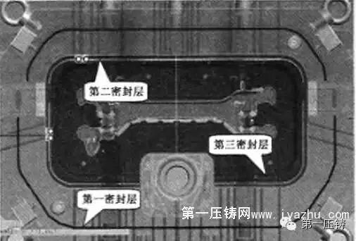 为确保模具的密封性能,采取了3层密封方法,见图6。第一层密封是环绕定模套板(也称模架)开设一密封槽,槽内装有15 mm线径的氟胶密封条。当模具合模时,动,定模套板在锁模力下贴合并压紧密封条,对型腔进行外缘密封。由于模架温度相对型腔镶块来说较低,而氟胶密封条的工作温度可达300℃。因此保证了密封条在高温下的使用寿命。
