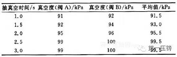表1是模具密封测试的结果。可以看出,当抽真空时间达到1.5 s,测得平均真空度就可达93 kPa.最高可以达到99.5 kPa,说明这种模具密封结构效果很好,能达到高真空压铸所要求的真空度。