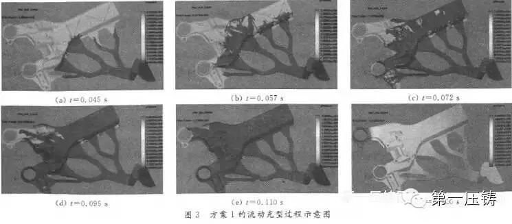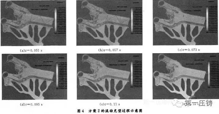对于方案2:①浇注系统横浇道分为6段,最大的一段对准结构最复杂的部位,最后填充最上方轴孔位置,符合真空压铸排气的要求;②后副车架结构对称,中间部 位结构简单,两边复杂,壁厚不均匀,其充型过程表现出复杂多样的特点。具体表现为。从整体来看,金属液表现为顺序充填,较为平稳,但在个别区域则表现为反 向充填。由于充型速度较快,金属液进入内浇口直接冲向对面型壁。同时,金属液是分多股进人型腔,在型腔某些部位金属液提前汇合,易包裹一定量气体形成气 涡。但由于采用了高真空,可以暂不考虑卷气情况。
