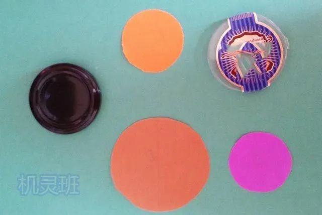 接下来准备制作轮子。取不同大小的圆形盖子,如果没有盖子,可以用圆形小杯子或盘子代替。将圆形盖子放在彩色卡纸上,沿着盖子外边缘画圆,再沿着画线将圆形剪下来。