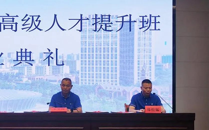 思屋电气集团董事长郑松猛(左一)与浙商总会执行秘书长解延海(右一)郑松猛董事长在本次提升班结业典礼上代表发言。他表示,将此次培训中获得的新思想、新知识运用到企业管理实践中去,成为企业发展的推动者和变革的引领者,更好地为广西经济发展贡献民营企业的力量。