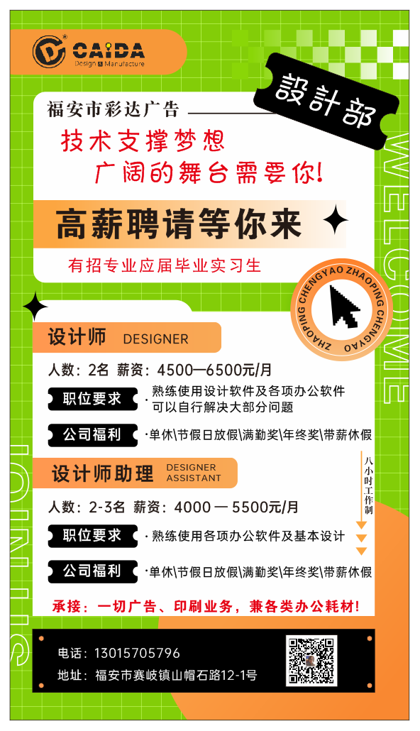 职位描述:福安市彩达广告技术支撑梦想 广阔的舞台需要你!高薪聘请等你来 有招专业应届毕业实习生 设计师 人数:2名薪资:4500-6500元/月 职位要求可以自行解决大部分问题熟练使用设计软件及各项办公软件 公司福利 ·单休)节假日放假\\\\\\\\满勤奖\\\\\\\\年终奖\\\\\\\\带薪休假 设计师助理 人数:2-3名薪资:4000-5500元/月 职位要求 ·熟练使用各项办公软件及基本设计 公司福利 ·单休)节假日放假\\\\\\\\满勤奖\\\\\\\\年终奖\\\\\\\\带薪休假 承接:一切广告、印刷业务,兼各类办公耗材! 电话:13015705796 地址:福安市赛岐镇山帽石路12-1号 八小时工作制