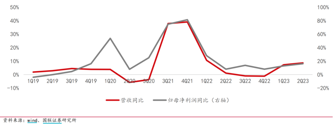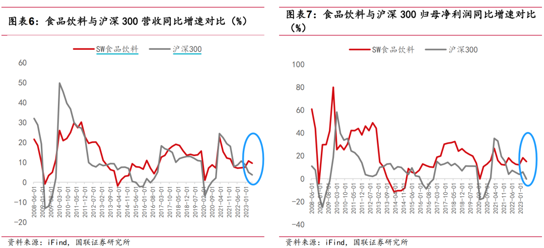 2023 年上半年,食品饮料营收同比增速为9.52%,归母净利润同比增速为14.93%,业绩同比增速高于沪深 300 的个位数增长。