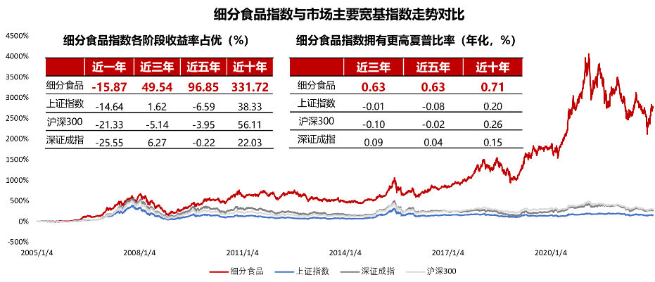 再看大A,同样也可以发现类似的规律。截至2022年12月31日,细分食品指数自基日(2004-12-31)以来大幅跑赢同期上证综指、沪深300、深成指等主流宽基指数,累计涨幅达2717%,在波动中累计上涨超30倍,实现了亮眼的长期回报。