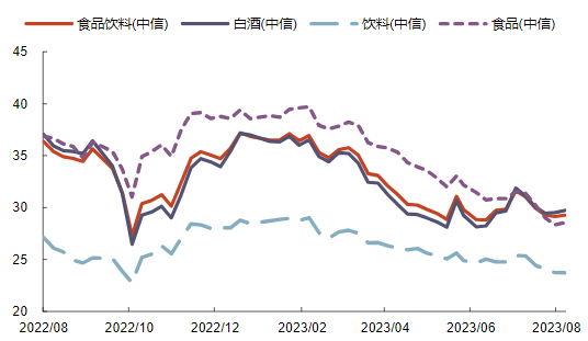 食品饮料板块市盈率(TTM,整体法,倍),资料来源:Wind,光大证券研究所,数据截至2023.09.01