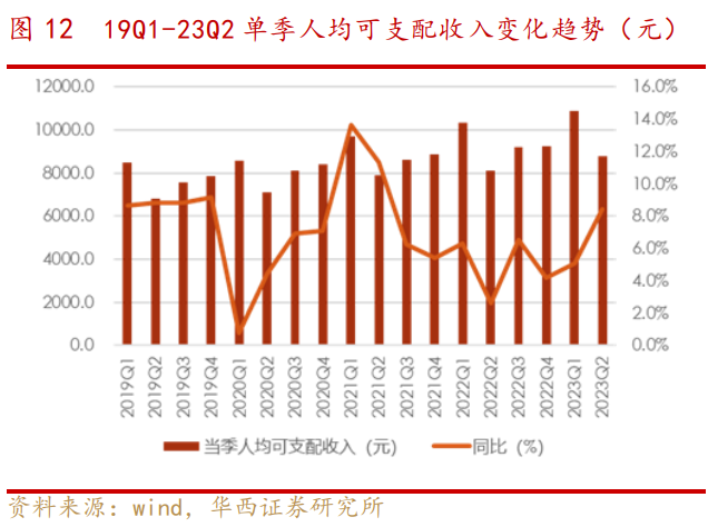 从居民人均可支配收入来看,二季度人均可支配收入同比增长8.4%,处在缓慢复苏中。今年上半年,我国居民人均可支配收入实际累计值同比增长5.8%,增速环比有所提升。