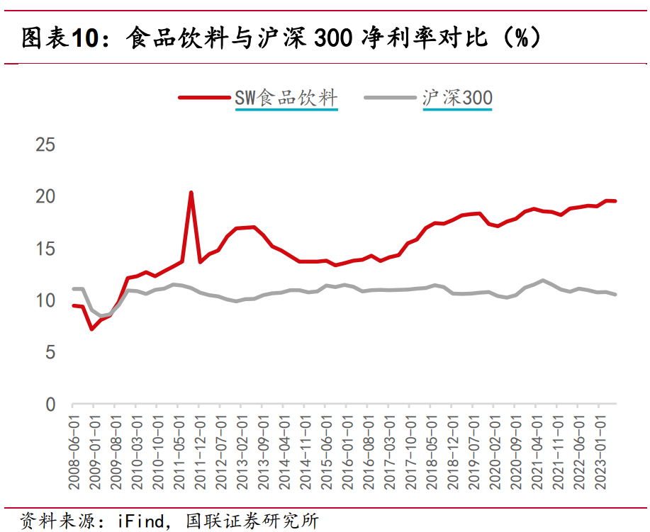 再从盈利能力看,食品饮料净利率稳中有升,盈利能力远超全A平均。