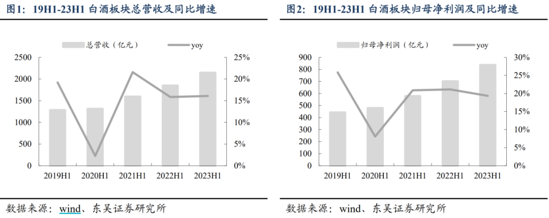 单就白酒来看,今年上半年白酒上市公司总营收约2146亿元,同比+16%;归母净利润约837亿元,同比+19%。多数酒企半年报收入利润实现双位数增长,业绩超预期。
