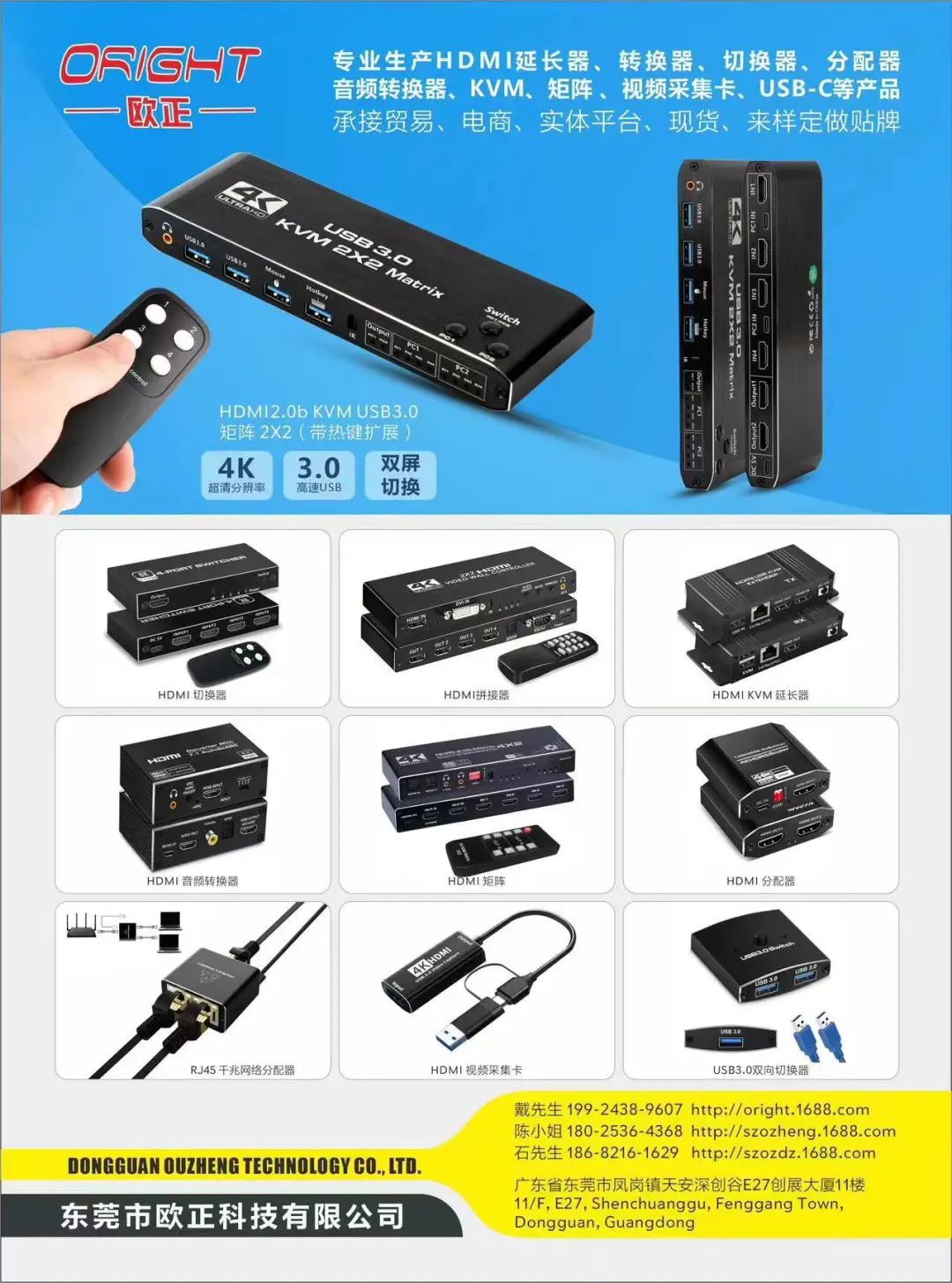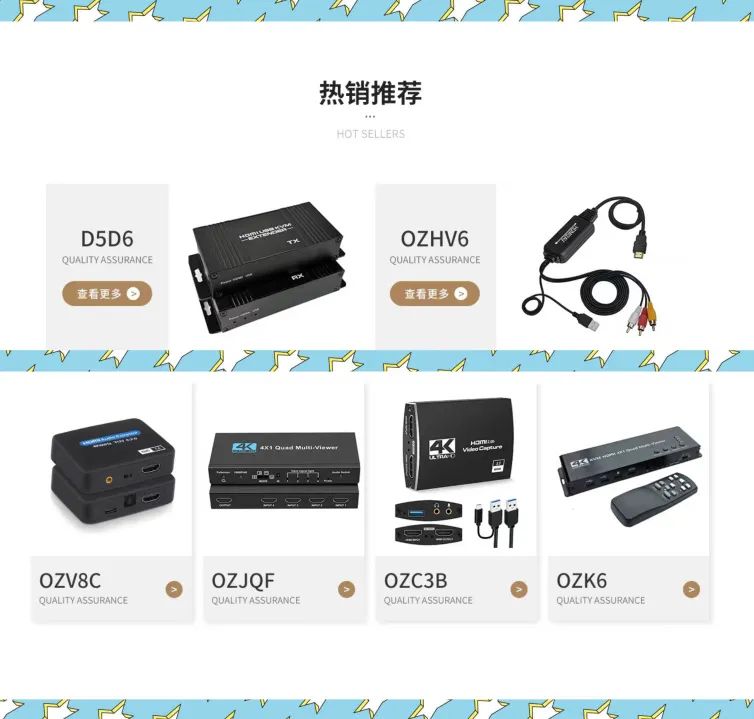 公司专业生产HDMI延长器、转换器、切换器、分配器、音视频分离器、KVM、矩阵、USB采集卡、TYPE-C系列,集设计研发、生产、销售、服务为一体,承接贸易、电商、实体平台、现货、来样定做贴牌。我们秉承品质至上的原则,期待与您合作!