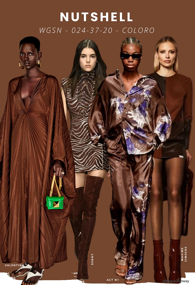 通过《色彩未来之窗》我们最终基色调是 Nutshell(Coloro 024-37-20)简而言之,Nutshell 是一种浓郁而辛辣的棕色,是一种跨季节的颜色,能唤起温暖和安心的感觉。它的灵感来自日益增长的节俭和转售文化以及决心改写创业和碎片生活规则的消费者,这种颜色代表着可持续性而非新鲜感,以及日益增长的怀旧情绪,消费者回归复古风格和颜色。