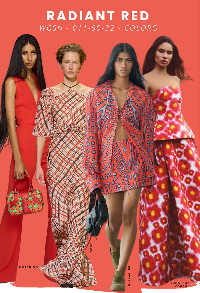 这红色感觉轻盈而年轻,但它的乐观性质与所有年龄人口和性别有关。光芒四射的红色在盛夏的同时,它是一个季节性的明亮,适合一系列时尚类别。品牌可以利用它的亮丽品质来激发自我护理和健康主导的美容、个人科技、家居用品和包装。Radiant Red还是3D设计、虚拟渲染空间和美颜滤镜的强大颜色,也是在Moschino、Jonathan Cohen、 Altuzarra等时装秀中使用的亮红色。