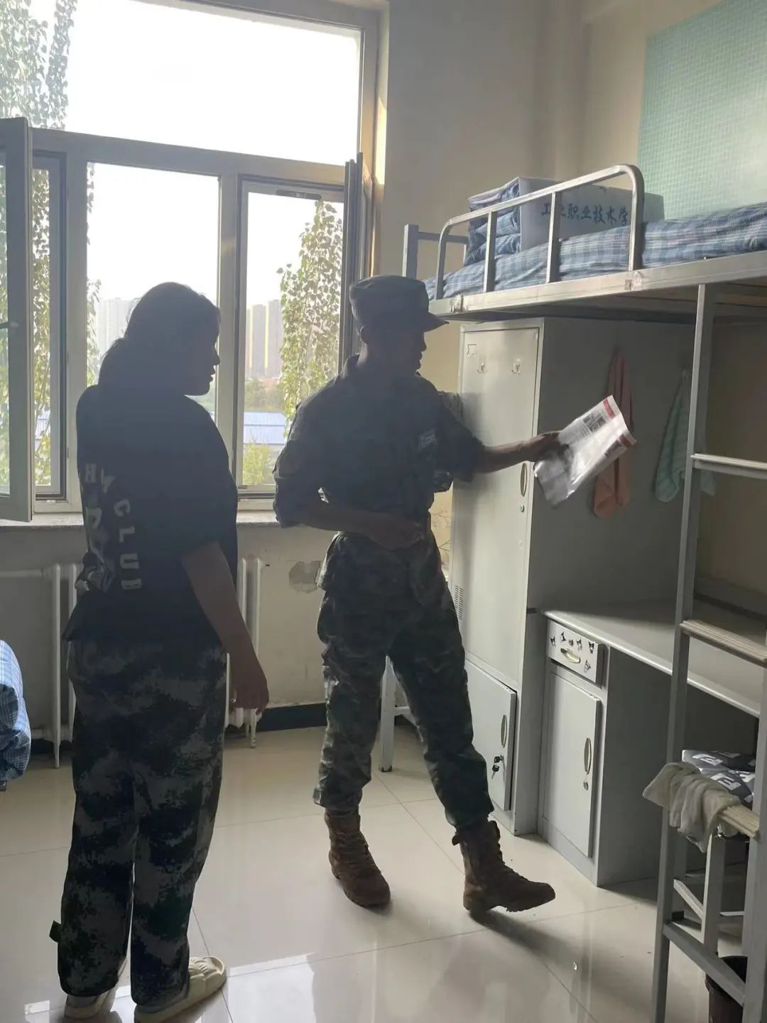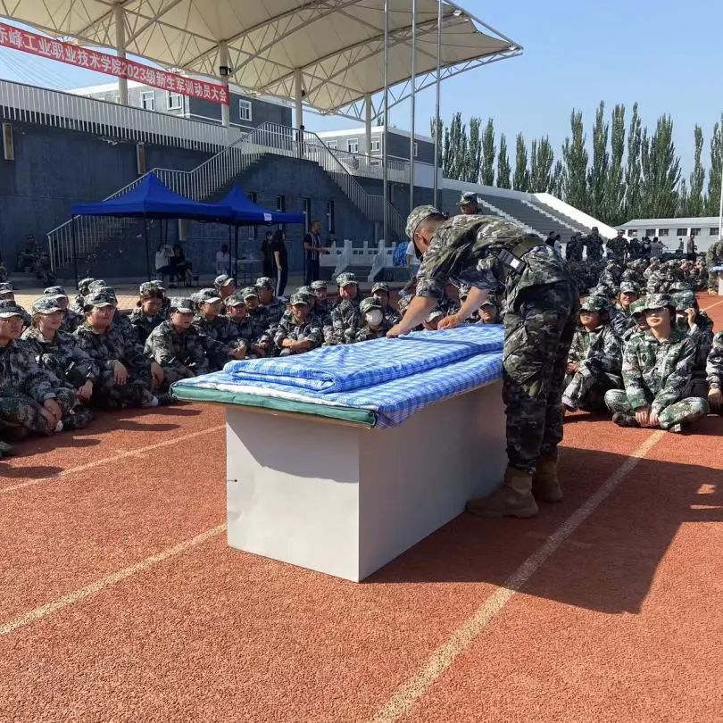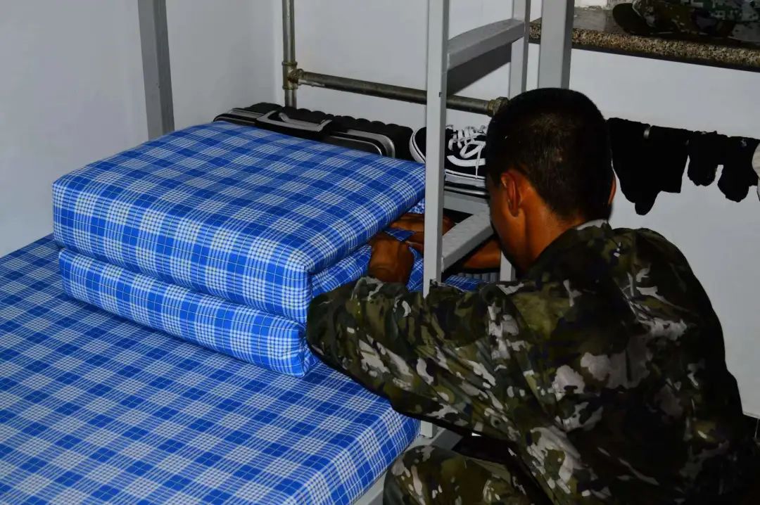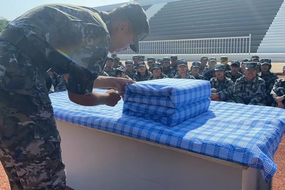 “出门看队伍,进门看内务”内务整理是军训的重要必修课之一,整洁卫生的宿舍环境,温馨和谐的宿舍氛围,是宿舍成员的共同愿望,也是度过美好大学生活的基础。在军训教官的带领下,大一新生们走进宿舍开展内务整理规范的学习环节。