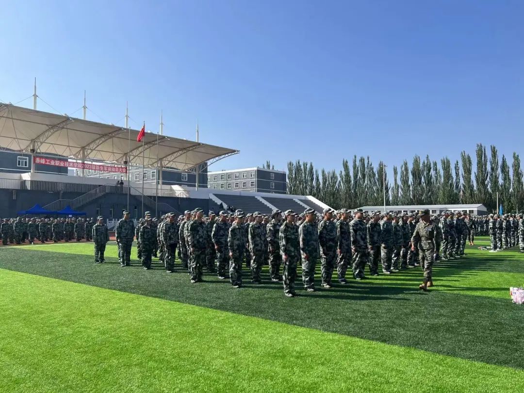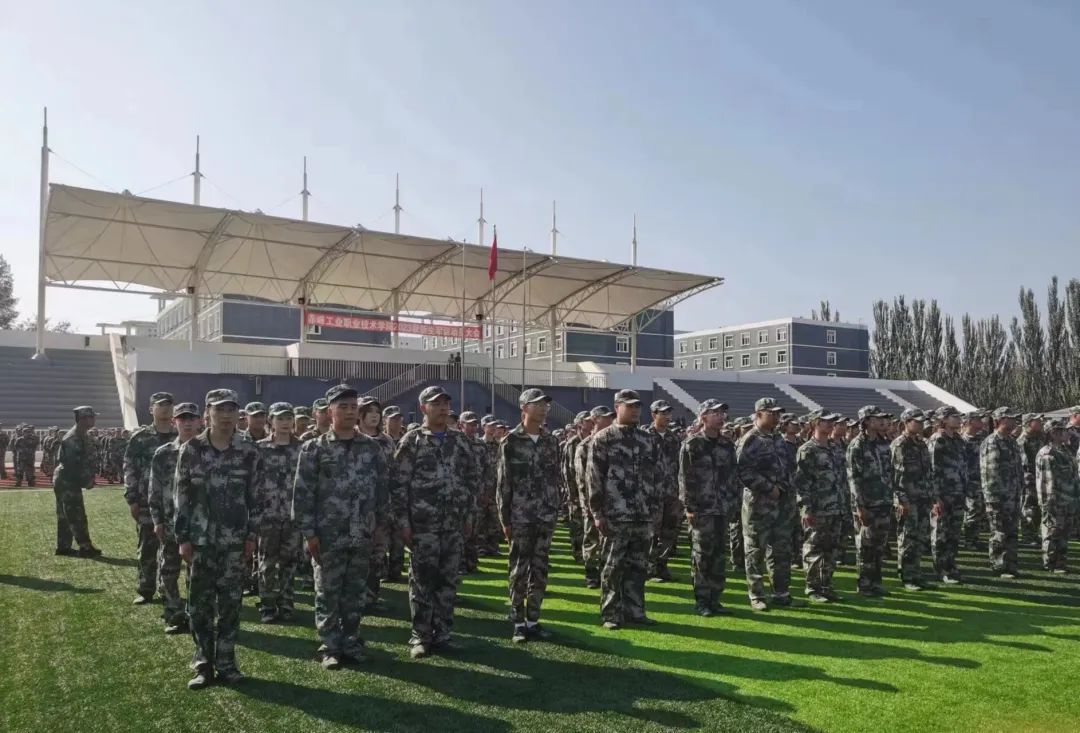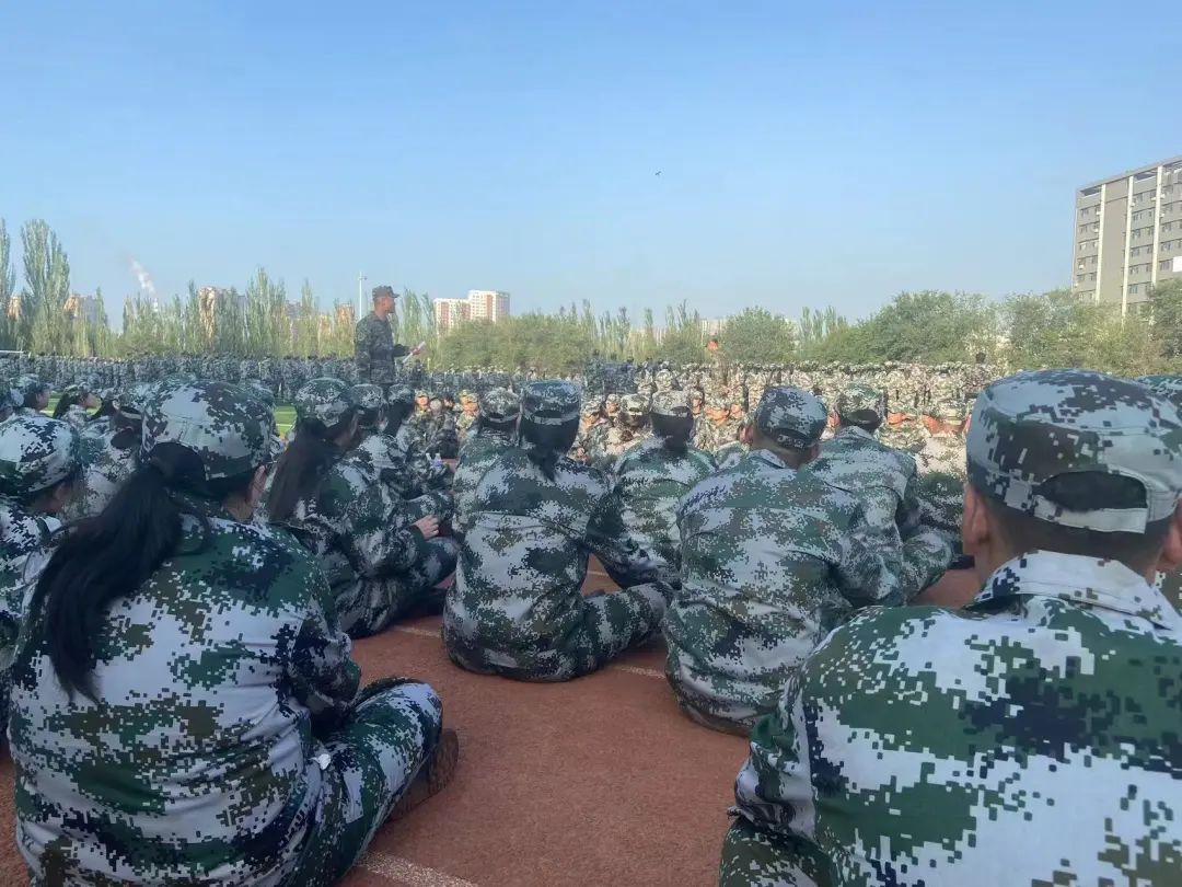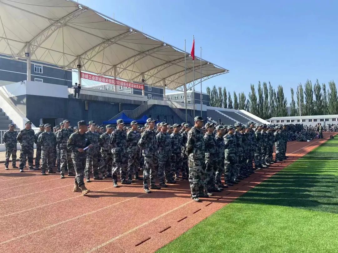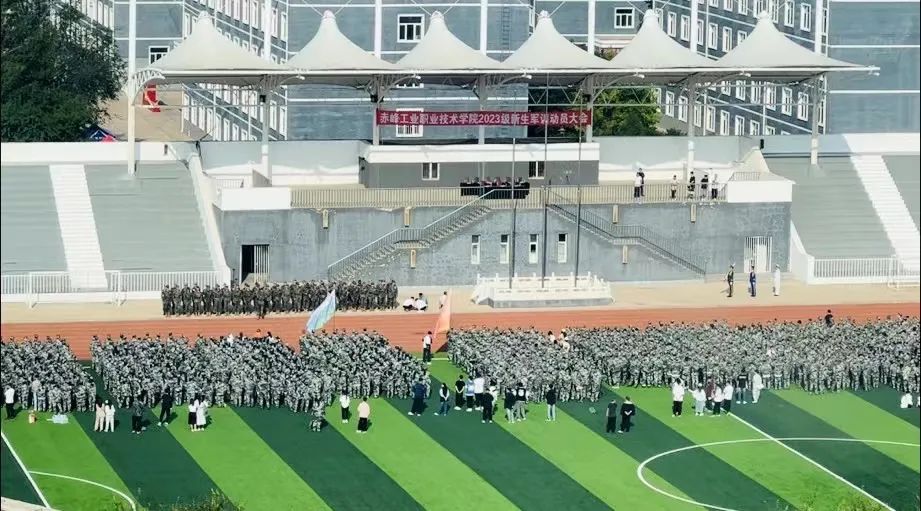 9月4日,开学第一天,2023级全体新生身着迷彩服雄赳赳、气昂昂的在操场集合。