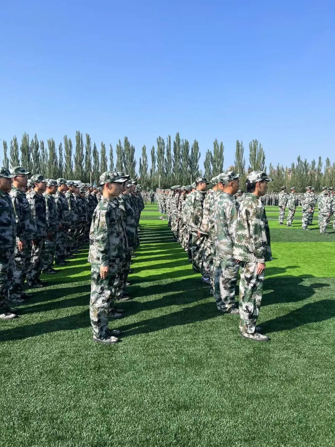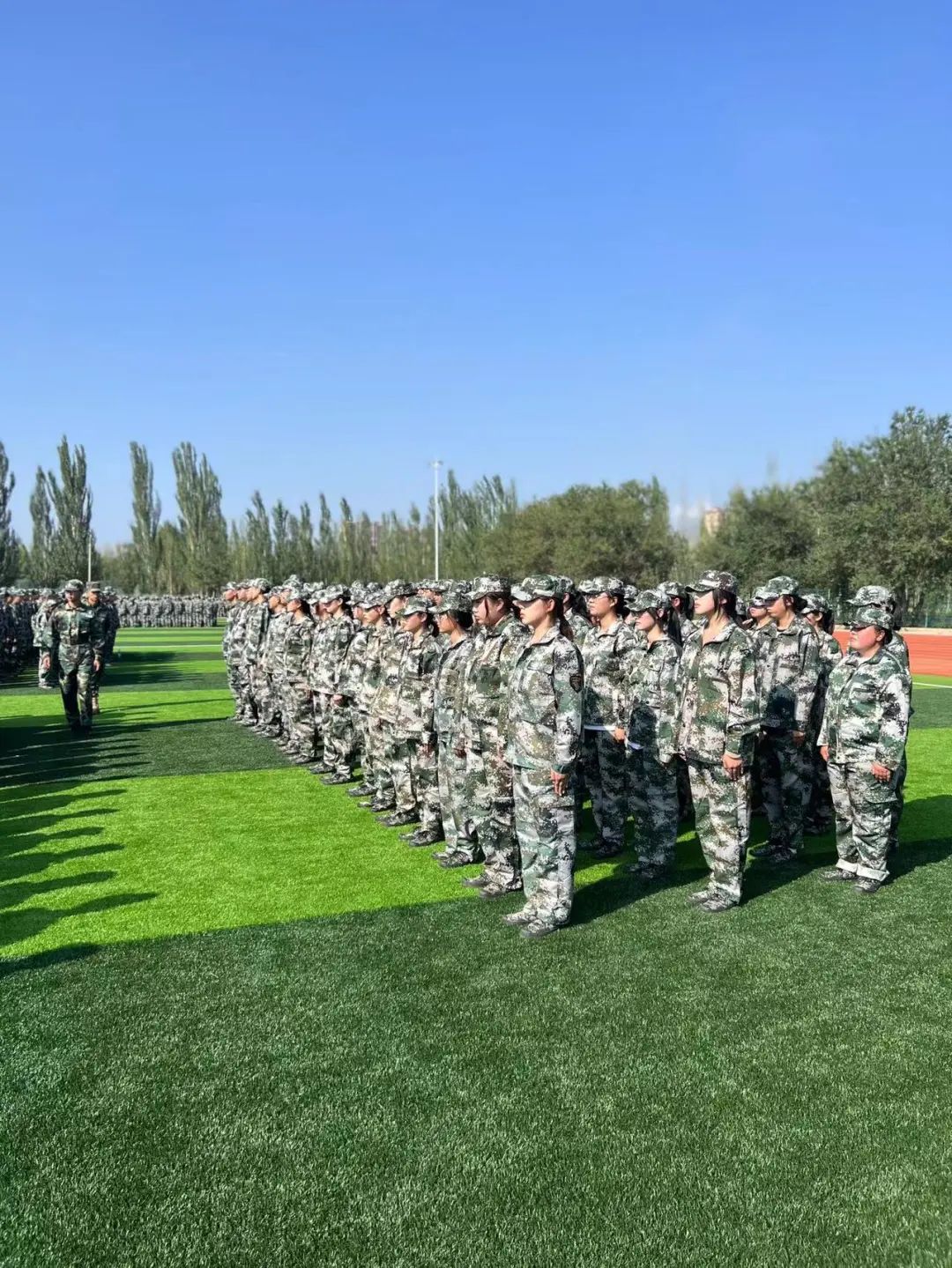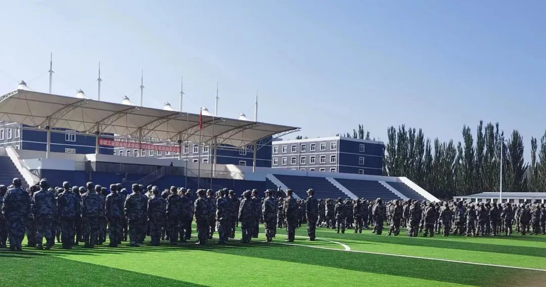 9月4日,开学第一天,2023级全体新生身着迷彩服雄赳赳、气昂昂的在操场集合。