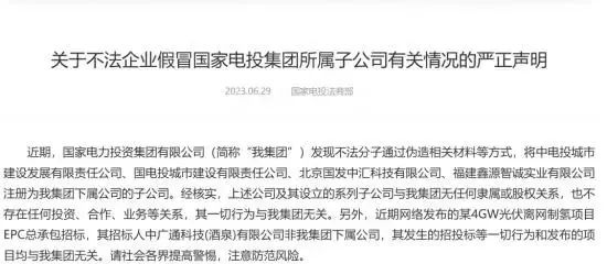 更令市场吃惊的是,6月29日,国电投发表声明:“中广通科技(酒泉)有限公司非我集团下属公司,其发生的招投标等一切行为和发布的项目均与我集团无关。”