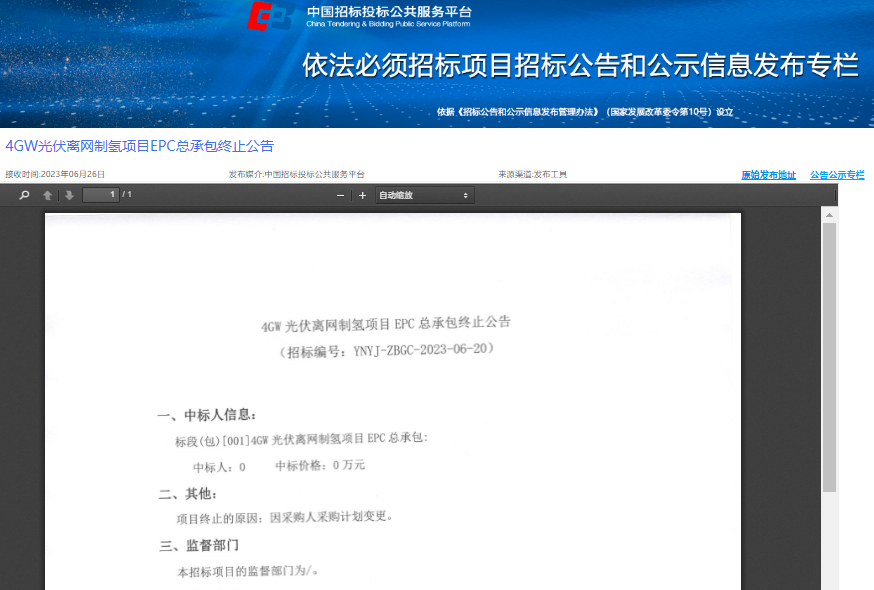 然而,仅仅在6天后,该项目因“采购计划变更”而终止。6月26日,中国招标投标公共服务平台发布《4GW光伏离网制氢项目EPC总承包终止公告》,公告显示项目终止的原因是“因采购人采购计划变更”。