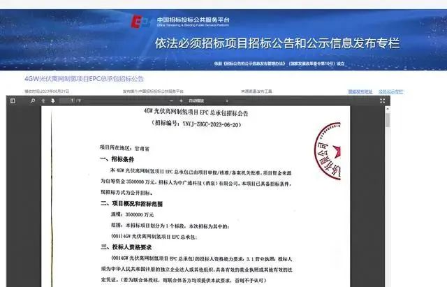 6月21日,一份甘肃4GW光伏离网制氢项目EPC总承包招标公告,在中国招标投标公共服务平台发布。文件显示招标主体为中广通科技(酒泉)有限公司(以下简称“中广通酒泉”),该项目资金来源为自筹资金350亿。如此大的光伏制氢项目公示后,引发市场高度关注。
